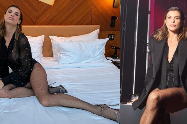 Elisabetta Canalis a Parigi con gambe in primo piano: sotto alla giacca solo body e calze a rete