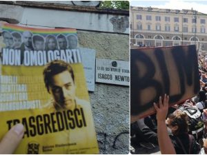 "Non omologarti, trasgredisci", si legge nel volantino distribuito dagli studenti di Azione Studentesca dove compaiono i volti anche di Roberto Saviano e Fedez.