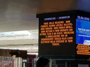 Ritardi a Roma Termini a causa di un guasto sulla linea elettrica della stazione. Si registrano rallentamenti e ritardi fino a 90 minuti nelle partenze e negli arrivi dei treni nel principale scalo romano.