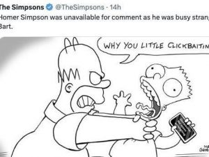 Matt Groening lancia un disegno sulla pagina Twitter de I Simpson che ritrae Homer mentre strangola Bart. Il messaggio dell'autore della serie animata sembrerebbe smentire la notizia circolata negli ultimi giorni riguardo l'iconica scena dello strangolamento tra padre e figlio: "Clickbait".