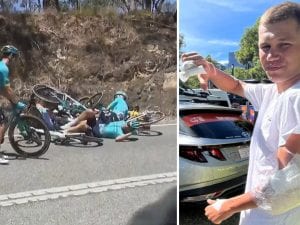 Rocambolesca caduta di tre corridori italiani della stessa squadra, l'Astana, che coinvolgono Luke Plapp, il favorito del Tour Down Under che si sta disputando in Australia. Escludendolo dalla vittoria in classifica generale: arrivato al traguardo con quasi 10 minuti, con molteplici escoriazioni sul corpo e tre dita steccate.
