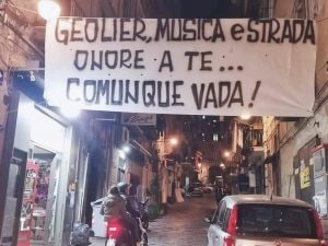 A Napoli tutto pronto per sostenere Geolier: non solo nel Rione Gescal, grande striscione anche ai Quartieri Spagnoli e San Giovanni a Teduccio.